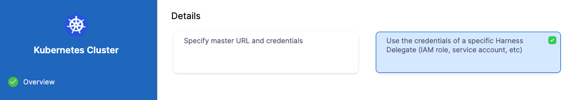 Select the Kubernetes Delegate you added earlier using its Tags, and then click Save and Continue. Harness verifies the Connector.