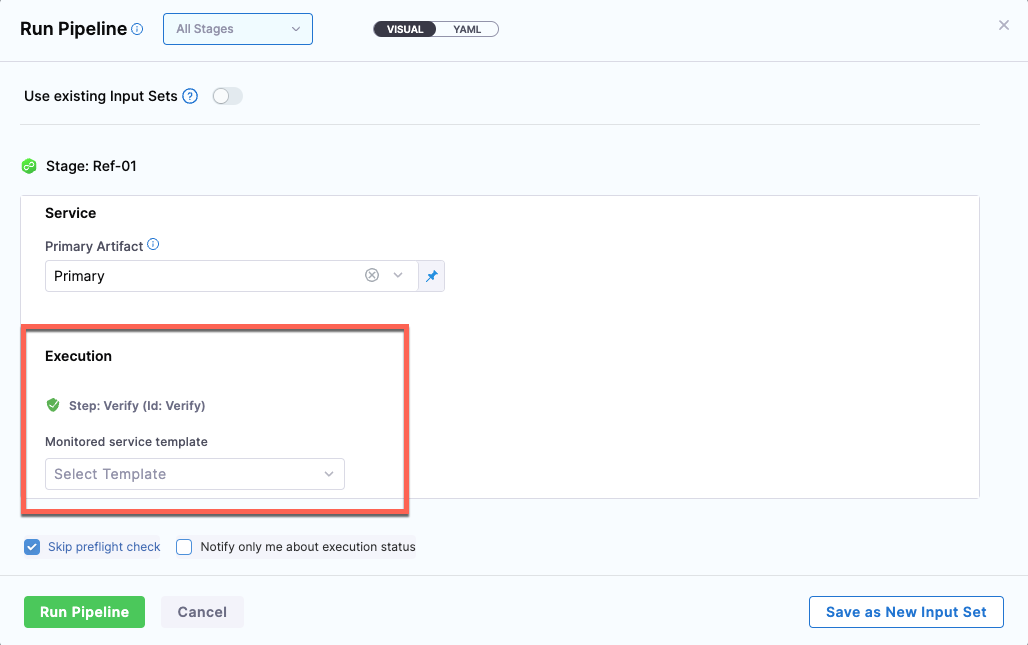 2. During run time, in the Run Pipeline page's Execution > Step: Verify > Monitored service template section, select Select Template.