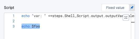 Here's an example showing how the Script Output Variables references the exported variable test, and how you reference the output variable Name var1 in a subsequent Shell Script step to get that value: