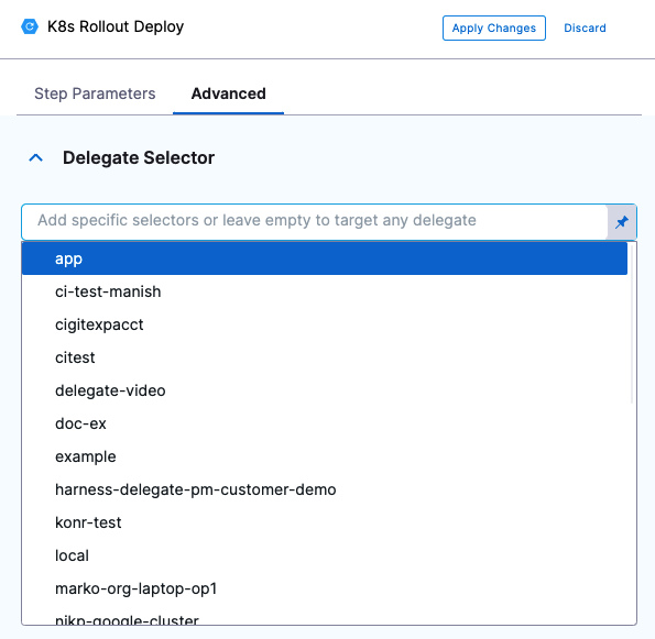 However, it is also possible to set a delegate at the step level using the Delegate Selectors advanced option. Choosing a selector in this method described above will override any previously selected delegate selector, including selections from the pipeline, stage, step group or infrastructure definition (via connector). This can lead to unexpected behavior.